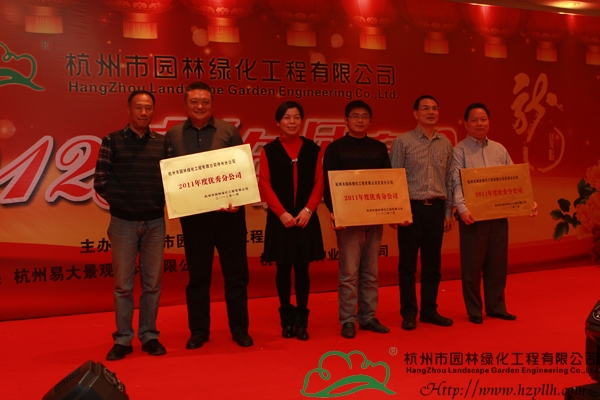 團拜會的一個重要環(huán)節(jié)是表彰2011年度的先進集體和先進個人。人力資源部副經(jīng)理李穎新宣讀表彰文件之后,進行了隆重的頒獎儀式,共頒發(fā)了優(yōu)秀分公司、優(yōu)秀市場拓展經(jīng)理、優(yōu)秀項目經(jīng)理、優(yōu)秀員工、新苗獎五個獎項,浙江省林業(yè)廳、杭州市林水局有關(guān)領(lǐng)導(dǎo),董事長吳光洪等為獲獎?wù)哳C發(fā)了證書和獎牌。