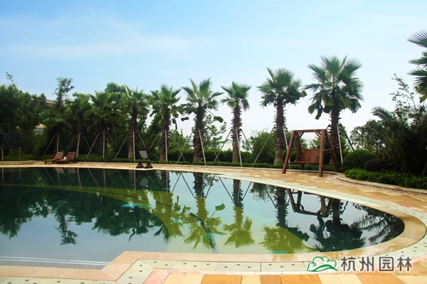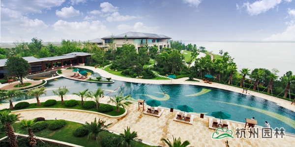 露天泳池區景觀獨具特色,選用華棕、棕櫚、布迪椰子、加拿利海棗等熱帶植物作為主景,營造出簡約大方、層次分明的濃郁熱帶園林風情。為了提高這些熱帶植物的成活率,降低后期的養護成本,這批植物都經過馴化,較能適應吳江的氣候條件。該區面積較大,從酒店的觀景平臺上往下看,泳池中間的小島就像彎彎的小船,仿佛要順流而下;水質清澈見底,水底大面積的藍色和黃色玻璃馬賽克,營造出波光鱗鱗的效果,偶有微風吹來,水面蕩起陣陣漣漪,流動的線條瞬間充滿了生機和活力,整個泳池仿佛都動了起來。岸邊的植物高大茂密,郁郁蔥蔥,透過樹叢的間隙,浩渺無邊的太湖水系與遠處的天際線連接在一起,恍然之間,好象是來到了充滿陽光、海浪、沙灘的南國熱帶海域,心情的舒暢不言自喻。