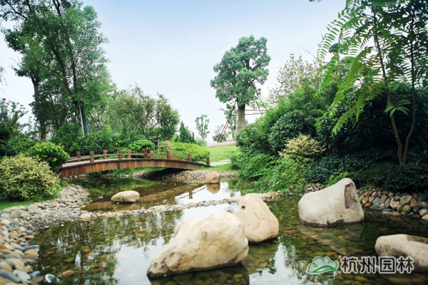 中心景觀區植物配置講究層次的錯落有致、季相色彩的豐富多變、天際線的分明起伏、林緣線和草坪線的視覺流暢,遵循大自然本身的多樣性、群落性、生態性的原則,營造出對比強烈、富有節奏和韻律感的園林景觀。其中,高層主要用榔榆、香樟、櫸樹、落羽杉,中層用桂花、紅楓、雞爪槭、白玉蘭,低層用紅梅、石楠、紅花檵木等,在有限的空間里,營造出變化多端的園林景致。一條旱溪沿著園路曲折蜿蜒,水質清澈見底,河底的鵝卵石散發出溫潤的光澤,仿佛已在河底沉寂了很多年。一座木橋橫跨小溪,隱約可見的園路吸引著人們探訪前方的美景。