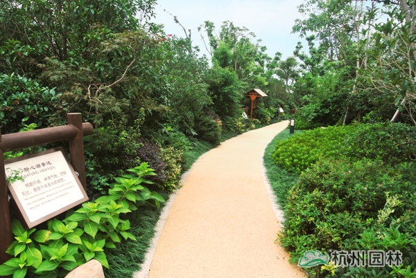 五千年的中國歷史文化,恢宏浩瀚,為園林造景提供了取之不竭的素材;園林景觀,也因為傳承了深厚的文化底蘊而散發出獨特的藝術魅力。作為一個旅游度假項目,對園林景觀的要求,不僅僅只是精致大氣、風韻天成的美景,更需要有深厚的文化底蘊,彰顯獨一無二的中國元素。為此,在2號樓大廳門前,用植物造景再現代表中國書法中筆畫大體的“永”字八法,彰顯中國書法的魅力;在泡池的建造上,運用老石碾、壓門石、老磨盤等老石材,打造出懷舊氣息濃郁的鄉土風情。