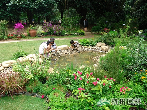 走進園內,蜿蜒的溪流和溪岸邊的景致野趣妙生,一下子撲入視野,清澈的溪水、光滑的卵石、可愛的小蝌蚪,與岸邊的銀邊菖蒲、水生鳶尾、花葉美人蕉、花葉蘆竹等水生植物一起,營造出生態、自然的河流景觀。“這條溪流,其實是我們杭州的母親河——錢塘江的縮影,通過這條溪流的營造,我們想呼吁更多的人保護生態、愛護環境,讓我們的母親河永遠干凈、清澈。”郭昌如簡短的話語中,透露出的是一名園林人渴望更多人關注水生態環境的殷殷期盼。