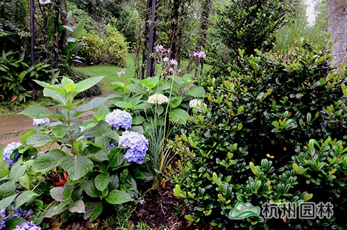 花園入口景觀:藍色的‘無盡夏’在翠竹及礬根的襯托下成功吸睛。