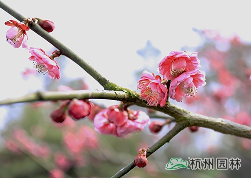 梅花Armeniacamume Sieb,薔薇科梅屬,落葉喬木,高達(dá)10m。花l~2朵單生,具短梗,芳香,在冬季或早春葉前開(kāi)放。梅樹(shù)蒼勁古雅,疏枝橫斜,梅花傲霜斗雪、凌寒獨(dú)開(kāi)、清雅俊逸。栽培歷史長(zhǎng)達(dá)2500年以上。古樸的樹(shù)姿,素雅的花色,秀麗的花態(tài),恬淡的清香,和豐盛的果實(shí),自古以來(lái)就為廣大人民所喜愛(ài),為歷代著名文人所謳歌。賞梅之風(fēng)自古至今連綿不絕,賞梅以聞香、觀姿、品風(fēng)骨為主。