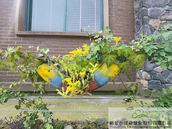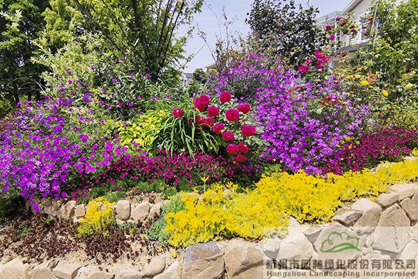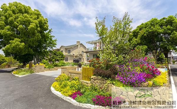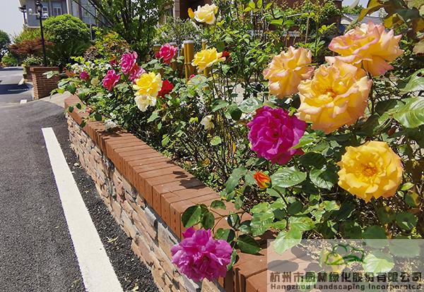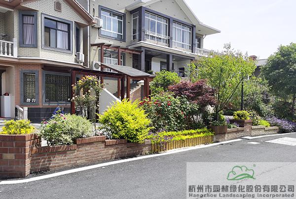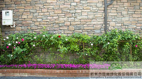 景墻邊的植物配置同樣有講究。利用銀杏、桂花、梅花、紅楓等植物營造上層空間,這些植物具有遮擋作用,能夠為庭院營造一定的私密空間。通過樹狀、球狀、攀援、傘狀、字母等各種形態的月季,金冠女貞球、龜甲冬青球、銀姬小蠟球、藍莓、八仙花、小葉梔子、翠蘆莉、花葉千鳥花、藍山鼠尾草、紫葉狼尾草等小喬灌木,在打造中層空間的同時,和美女櫻、金娃娃萱草、花葉玉蟬花、花葉香桃木、紫菀、澤蘭、礬根、五彩絡石、石竹等下層空間植物一起,裝飾和襯托景墻,使家家戶戶的景觀更加豐富多變。