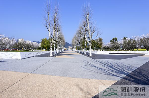 從各個廣場到沿溪綠道,全部采用透水混凝土材料,并在兼顧排水功能的同時,通過色彩、圖案的變化,營造移步換景的濱水景觀。廣場鋪裝主要選用深灰、淺灰、土黃等色彩的透水混凝土材料,根據現場景觀配色需求,設計不同的鋪裝組合,營造大氣自然、豐富多變的廣場景觀。靈溪公園入口處的波紋廣場,則以藍色透水混凝土材料為主,搭配亮麗的黃色,營造出流暢自然、色彩明亮的波紋效果,充滿了流動的旋律,再加上極富特色的異形樹池、坐凳,整個廣場又呈現出時尚的現代風情,帶給人們更加豐富的濱水景觀體驗。