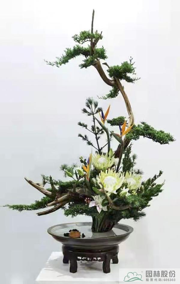 另有極富意境的《云崖青嶠》插花作品,選崖柏、龍柏、鋪地柏、五針?biāo)伞⒌刍驶?、重瓣百合花、粉色和白色金絲桃、天堂鳥,以成云崖青嶠之作。云為雅意,崖寓故訓(xùn),青色入觀,嶠在畫外。如此,松風(fēng)若過,花開舒卷,青紅果結(jié),臨水照影。清澗之曲,碧松之陰,相映成趣,著手成春矣。