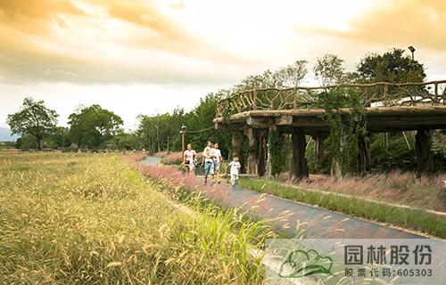 以彩色稻、彩色農作物圍繞村莊營造爛漫的七彩農田,區域承載兒童田園游樂、研學教育、農事體驗、果蔬采摘、休閑觀光等功能為一體,打造寓教于樂的自然育樂新田園。結合場地內現有的水塘和林地,打造集林、田、水不同自然層次、區別于城市鋼筋混凝土的鄉田無動力童趣樂園。