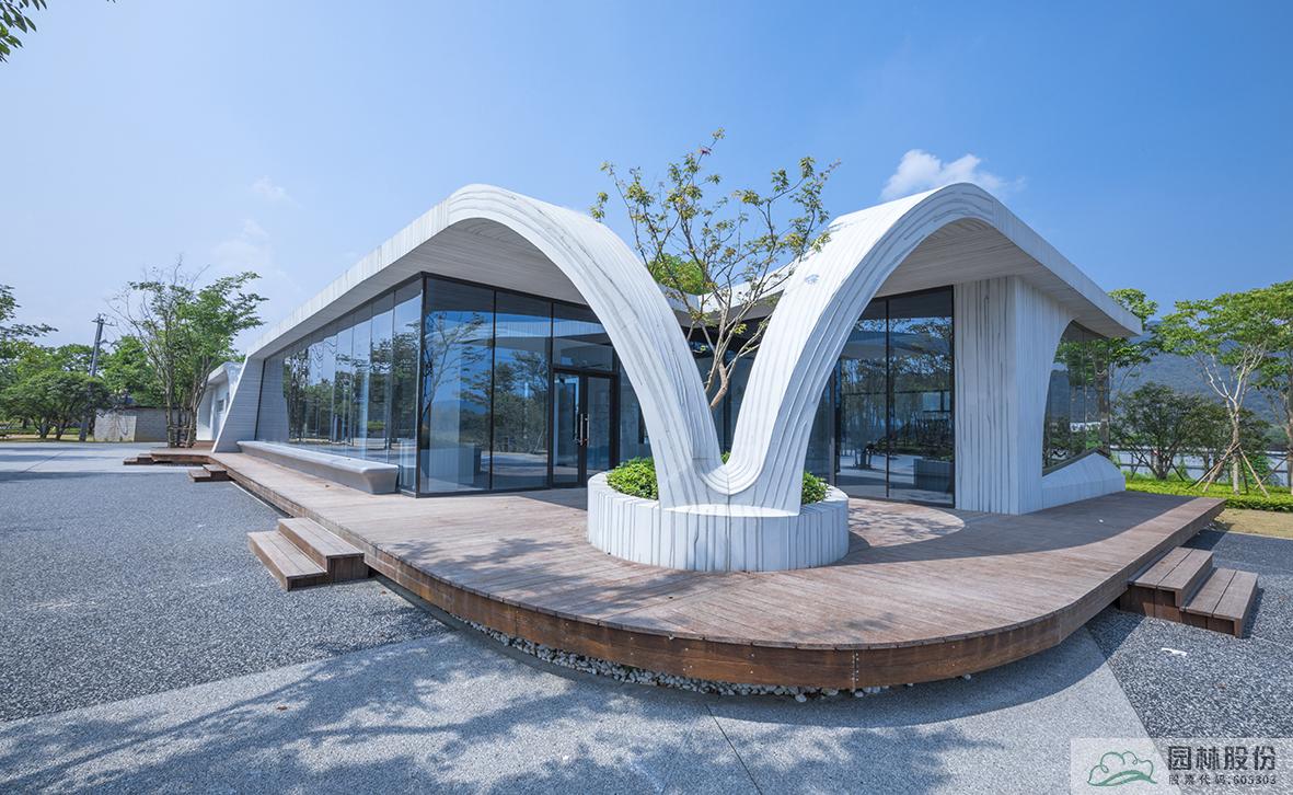 項目利用中心湖蜿蜒的湖灣和眾多洼地,引水入園,形成沿湖而生的各個景點。湖區背山面水,視線開闊,能遠望城市。沿線眾多湖灣處,設置各色景觀橋連通內塘與外湖的生態通道,同時景觀建筑依水而建,與周邊景色相映成趣。
